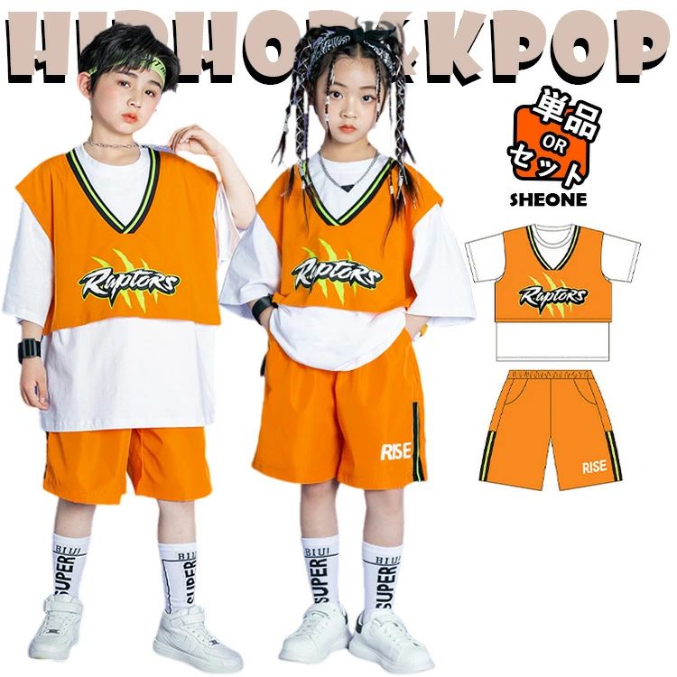 オレンジ 半袖 夏 キッズ ダンス衣装 セットアップ 男の子 女の子 レトロ カジュアル トップス ショートパンツ ダンスウェア ヒップホップ ジャズダンス ポッピング 韓国 演出服 練習