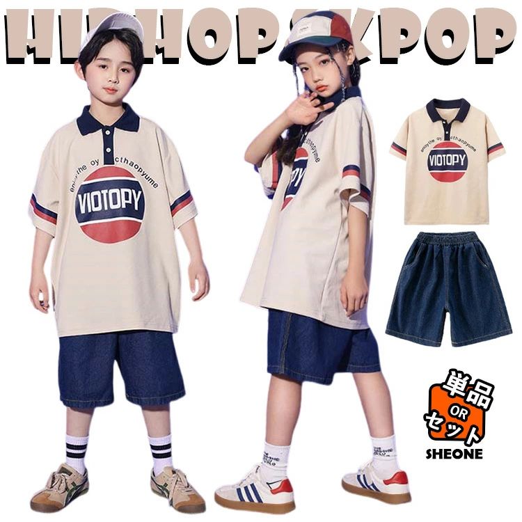 キッズ ダンス 衣装 派手 発表会 ベージュレトロ ロング丈 ヒップホップ 韓国 ダンス衣装 セットアップ 半袖 トップスデニム ショートパンツ ゆったり ストリート オシャレ カッ