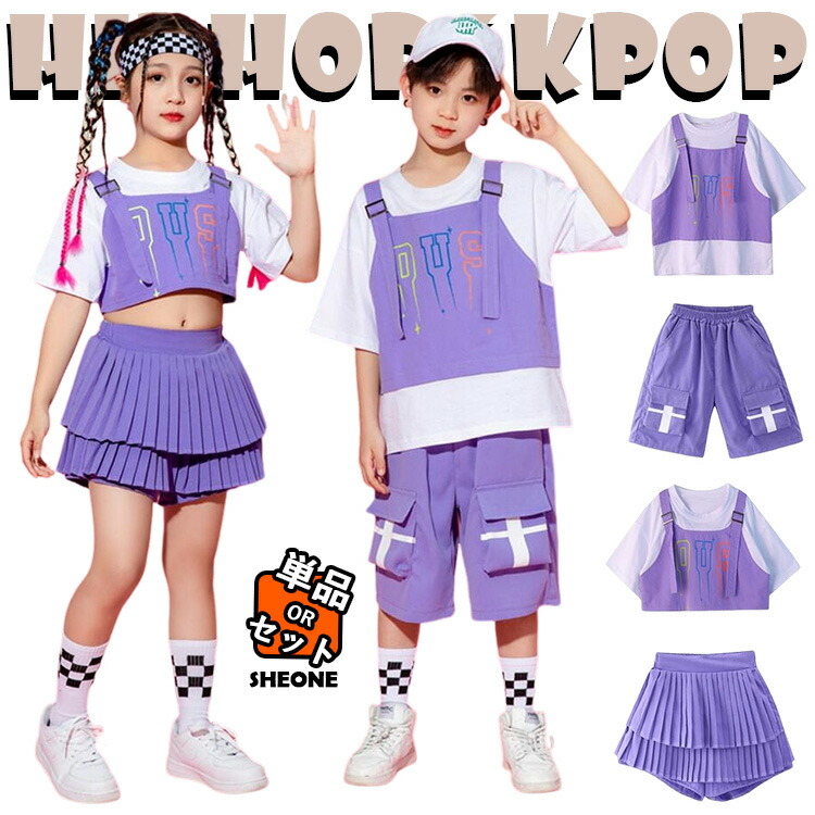 パープル キッズ へそ出し スカート ショートパンツ 短パン トップス ダンス衣装 セットアップ tシャツ ショートトップス ヒップホップ ポッピング チアガール 演出服 練習着 団体服