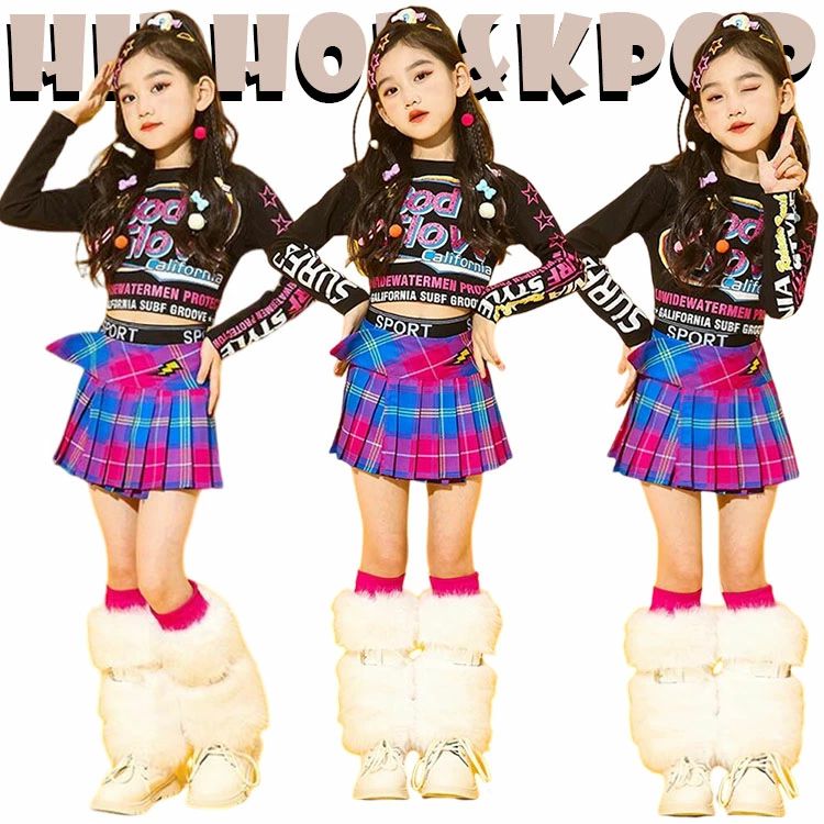 チェック柄 キッズ ダンス衣装 セットアップ ジャズ 女の子 子供 柄トップス ショートトップス スカート 足カバー ふわふわ チアガール ポッピング ジャズダンス おしゃれ hiphop フ