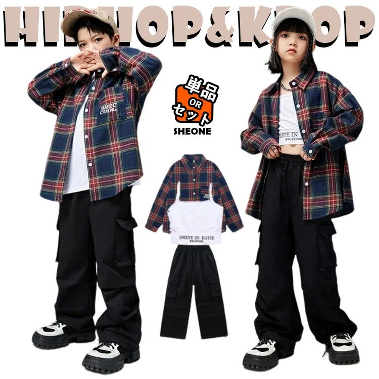 カジュアルシャツ タータンチェック キッズ ダンス衣装 セットアップ 男の子 女の子 シンプル かっこいい ファッション カーゴパンツ Tシャツ ヒップホップ HIPHOP 子供服 ジャズダ