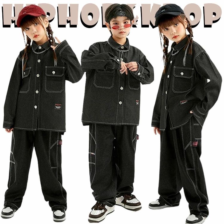 黒色 デニムセット パッチワーク キッズ ダンス衣装 セットアップ 女の子 長袖 ジャケット 男の子 かっこいい ゆったり カジュアルシャツ スーツ トップス デニムパンツ ジャズダンス