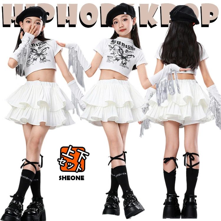 白 ホワイト シルバー へそ出し ショート丈 トップス スカート プリーツスカート 2点セット 半袖 タンクトップ キッズ ダンス衣装 ホワイトスカート ダンススカート ぴったり かっこ