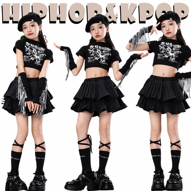ショート丈 トップス スカート 女の子 チア チアガール 韓国k-pop jazz ブラック シルバー へそ出し プリーツスカート セットアップ 半袖 タンクトップ 靴下 脚カバー キッズ ダンス
