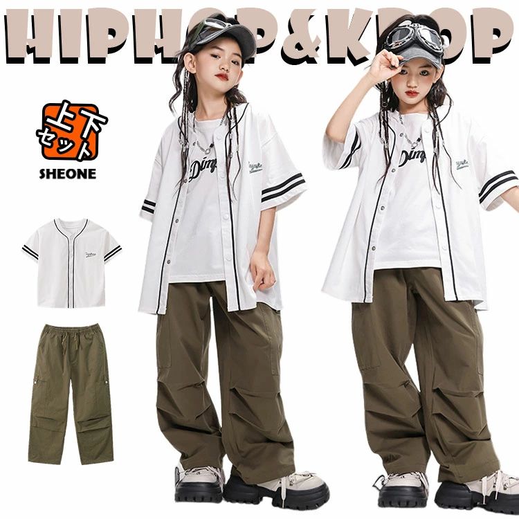 ベースボールシャツ 白 カーキ キッズ ダンス衣装 セットアップ 女の子 男の子 子供 トップス パンツ カジュアル カーゴパンツ ヒップホップ ジャズダンス ポッピング 演出服 練習着