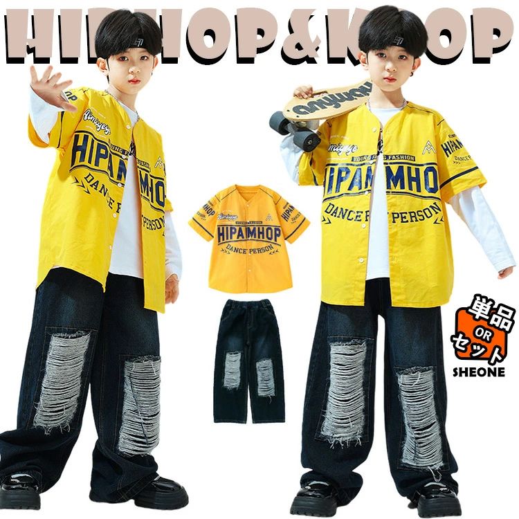 イエロー ブルー+グレー 柄シャツ トップス 半ズボン ダメージジーンズ デニム ジーンズ 単品販売 上下セット セットアップ シャツ tシャツ 長袖 半袖 男の子 子供 キッズ ダンス衣