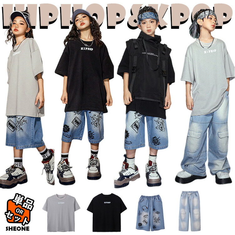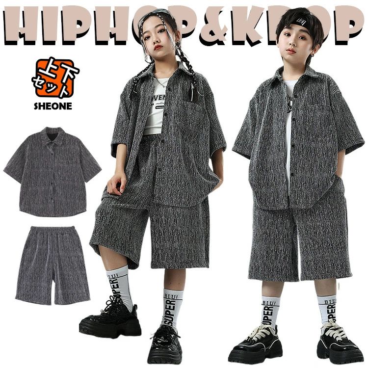 灰 黒 シャツ デニムパンツ キッズ ダンス衣装 セットアップ 上下セット おしゃれ 女の子 男の子 子供 かっこいい かわいい ゆったり 半袖 トップス 短パンツ ダンスウエア ヒップホ