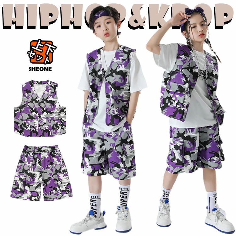 迷彩柄 パープル ベスト 半ズボン 迷彩ベスト 迷彩服 白 シャツ トップス 上下セット セットアップ ベストセット カジュアル 柄シャツ 袖無し 半袖 男の子 女の子 キッズ ダンス衣