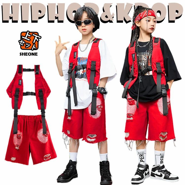 赤 レッド ベスト 半ズボン ダメージジーンズ トップス 上下セット セットアップ ベストセット カジュアル 袖無し 男の子 女の子 キッズ ダンス衣装 ゆったり かっこいい おしゃれ パ