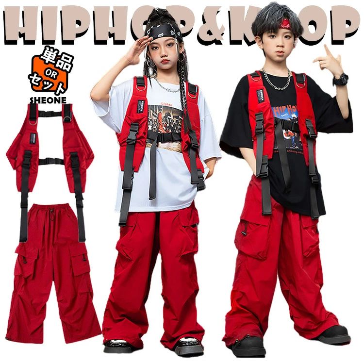 赤 レッド ベスト ズボン カーゴパンツ ジーンズ 2点セット セットアップ ベストセット カジュアル 袖無し 子供 男の子 女の子 キッズ ダンス衣装 ゆったり かっこいい おしゃれ パフ