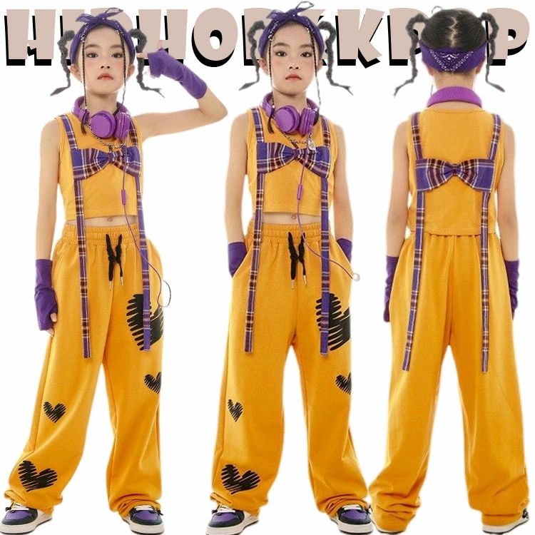 紫 イエロー チェック柄 へそ出し カーゴパンツ キッズ ダンス衣装 セットアップ 子供 カジュアル ショートトップス タンクトップ ロングパンツ ジャズダンス ヒップホップ チアガー