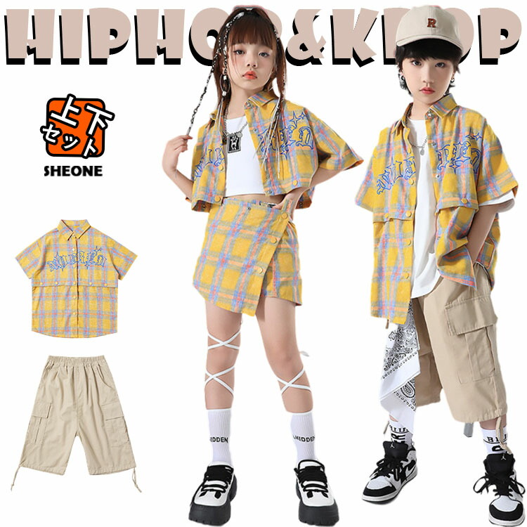 イエロー チェック柄 カジュアルシャツ カーゴパンツ キッズ ダンス衣装 セットアップ 上下セット 韓国 k-pop おしゃれ 女の子 男の子 子供 かっこいい かわいい ゆったり 半袖 スカ