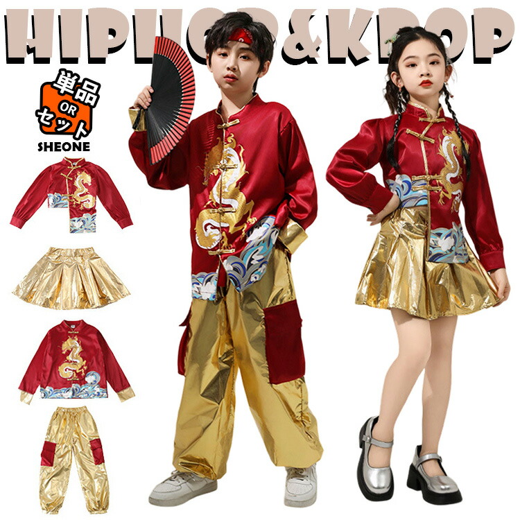 中華風 古典 レッド トップス ゴールド スカート パンツ キッズ ダンス衣装 セットアップ 上下セット 韓国 k-pop おしゃれ 女の子 男の子 子供 かっこいい かわいい ゆったり チャイ