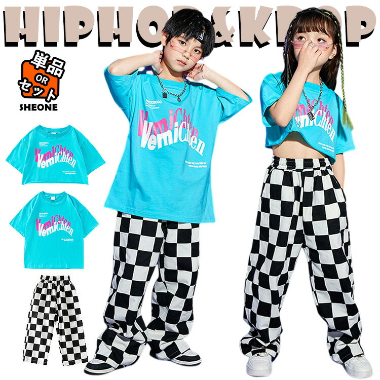 ブルー Tシャツ チェッカー ウェストパンツ キッズ ダンス衣装 セットアップ 上下セット 韓国 k-pop おしゃれ 女の子 男の子 子供 かっこいい かわいい ゆったり 半袖 トップス ダン