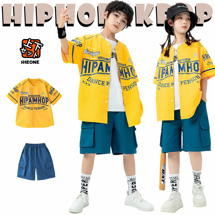 イエロー ベースボール ブルー カーゴパンツ 短パンツ キッズ ダンス衣装 セットアップ 上下セット 韓国 - おしゃれ 女の子 男の子 子供 かっこいい かわいい ゆったり 半袖 トッ