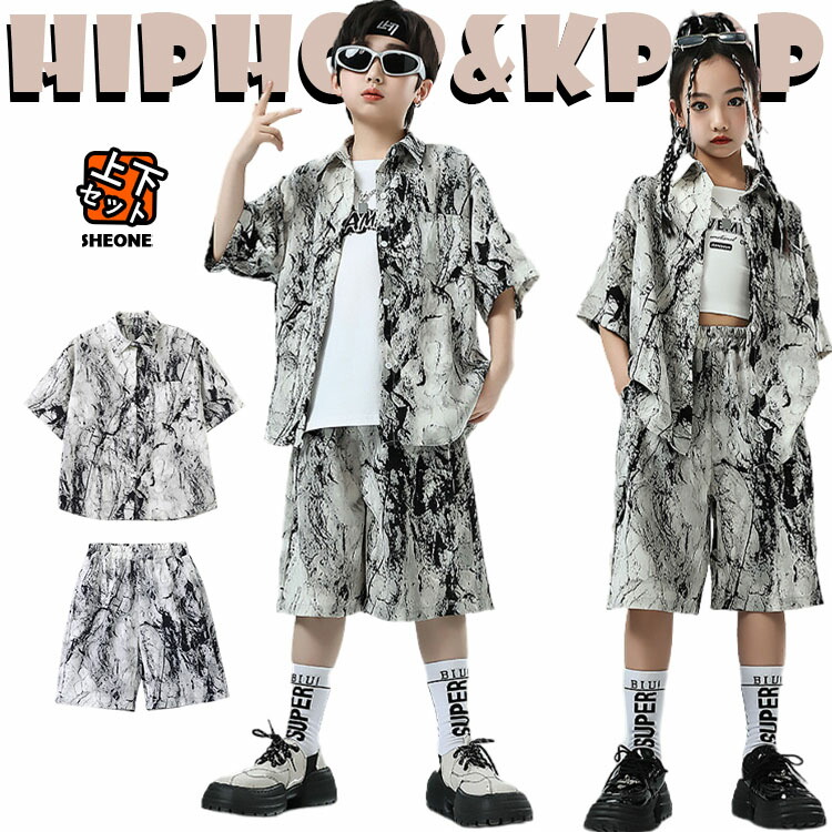 グレー カジュアルシャツ 短パンツ 総柄 キッズ ダンス衣装 セットアップ 上下セット 韓国 k-pop おしゃれ 女の子 男の子 子供 かっこいい かわいい ゆったり 半袖 タンクトップ Tシ
