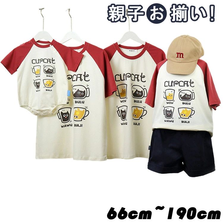 リンクコーデ 親子 セット 英語字 猫 ペアシャツ 親子 親子コーデ 親子 ペアルック レッド 白 赤ちゃん ロンパース シャツ 春 家族 お揃い シャツ 可愛い 夏 親子 お揃い服 ベビー