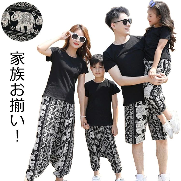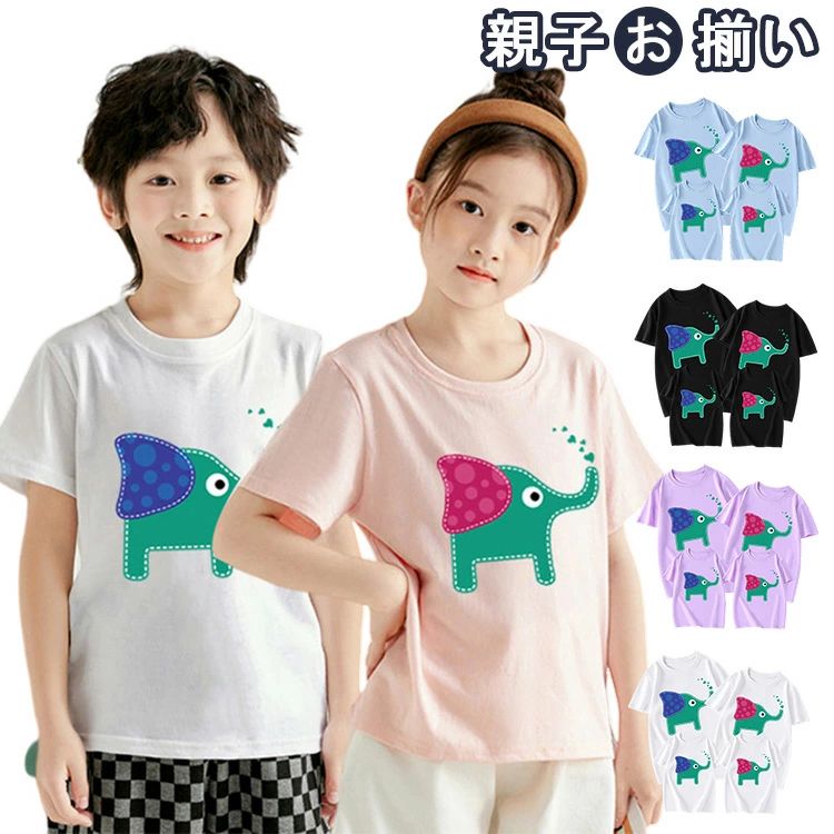 リンクコーデ 親子 セット tシャツ 半袖 春 夏 親子 ペアルック 動物柄 ゾウ 象 ペアtシャツ 子供 ハハ パパ 黒 白 グリーン パープル ピンク ブルー 親子コーデ トップス 家族旅行