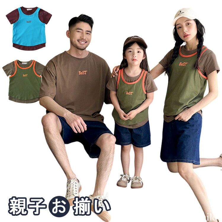 リンクコーデ 親子 セット 半袖 親子 ペアルック 赤 緑 tシャツ ベスト 親子ペア トップス 子供 ハハ パパ 親子コーデ 2点セット 姉妹 兄弟 家族旅行 家族活動 お揃い服 子供服 上着