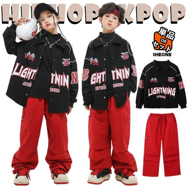 キッズ ダンス衣装 セットアップ 男の子 女の子 黒色 赤 ゆったり 長袖シャツ ロングシャツ ジャケット カジュアルシャツ トップス かっこいい ダンスパンツ サルエルパンツ ジャズ