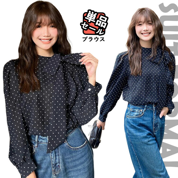 卒業式 ブラウス レディース トップス 長袖 春秋 可愛い お洒落 薄手 ドット柄 ラウンドネック キャップスリーブ ゴム入り フロント ボタン 前開き バック 切り替え 着回し ドット柄
