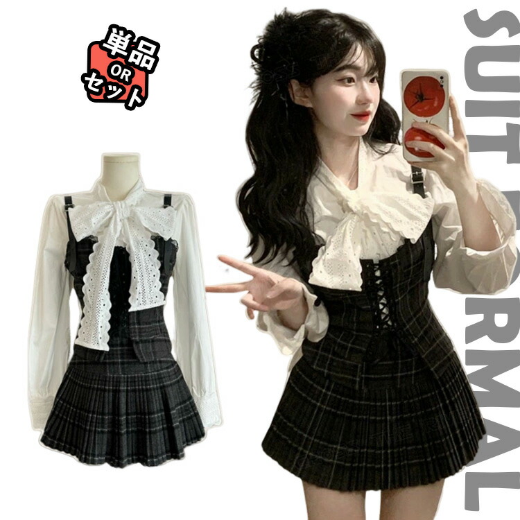 なんちゃって制服 韓国 制服 セット レディース 高校生 卒業式 スーツ 女の子 卒服 ベスト ブラウス スカート チェック柄 グレー リボン レース 白シャツ 長袖 ジュニア 中学生 フォ