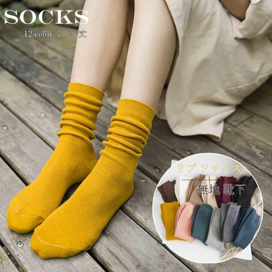 リブソックス レディース ミドル丈 靴下 無地 綿混 ソックス 通学 薄手 カラバリ 靴下スポーツ アウトドア テニス レディースウェア ソックス