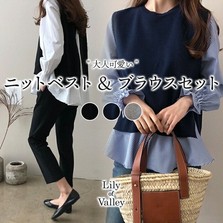 大人可愛いがたっぷり詰まった主役級トップス ニット ベスト セット ペプラム チュニック ブラウス カットソー ティアード フレア ゆったり ボリューム袖 フリル ドッキング 春夏