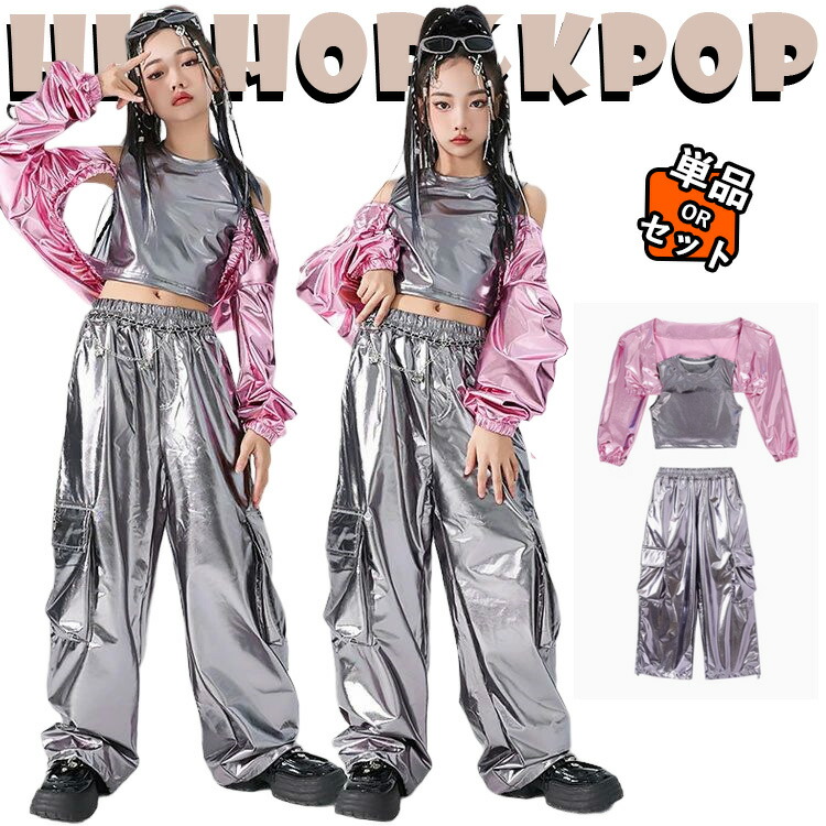反射柄 シルバー ピンク キッズ ダンス衣装 セットアップ 女の子 長袖 ケープ タンクトップ ノースリーブ へそ出し 肩だし トップス jazz hiphop シルバー カーゴパンツ サルエルパン