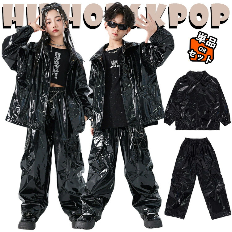 反射柄 黒色 革 キッズ ダンス衣装 セットアップ ユニセックス衣装 女の子 男の子 長袖 シャツ カジュアルシャツ ゆったり ファッション hiphop トップス カーゴパンツ サルエルパン