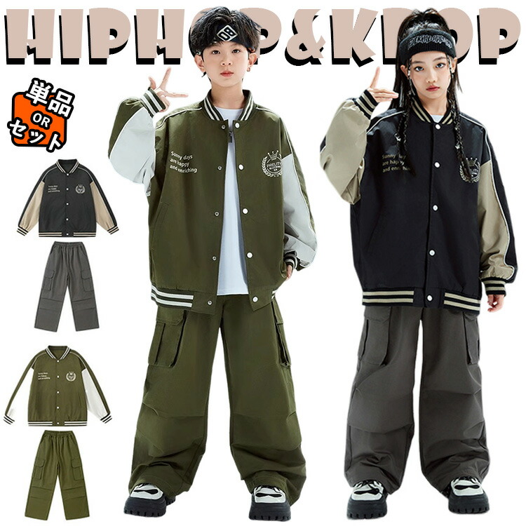 スタジャン ゆったり キッズ ダンス衣装 男の子 女の子 長袖 ジャケット カーゴパンツ 黒 カーキグリーン トップス パンツ セットアップ かっこいい ダンスウェア ヒップホップ ジャ