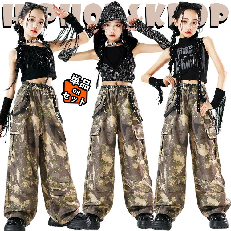 韓国 jazz 迷彩 カーゴパンツ ブラック トップス 腕カバー ベルト 帽子 キッズ ダンス衣装 セットアップ 上下セット おしゃれ 女の子 かっこいい かわいい へそ出し ダンスウエア ヒ