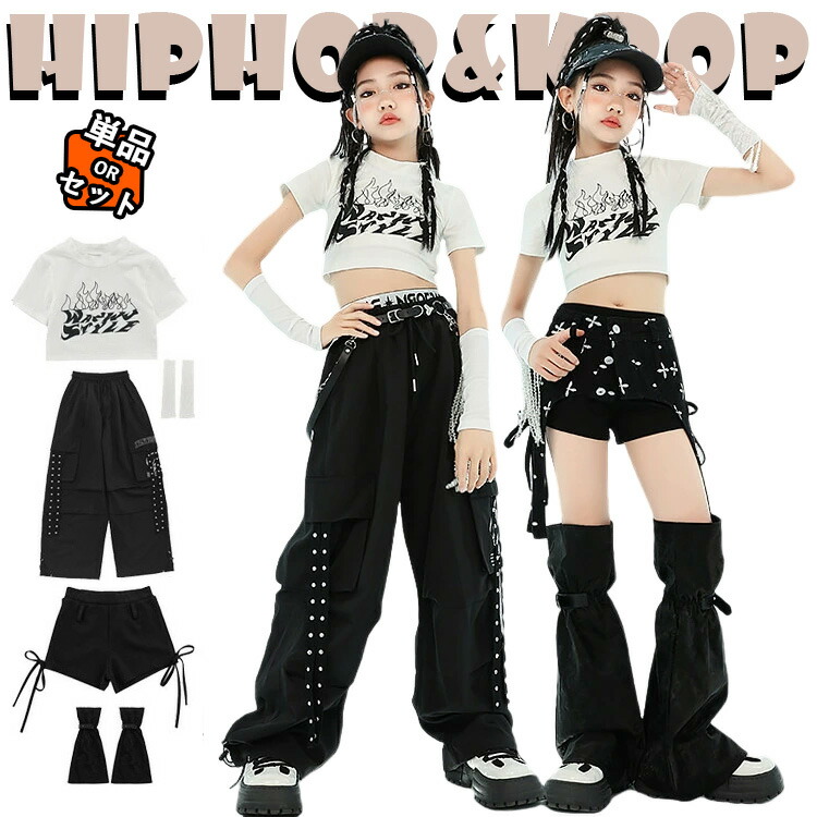 白 半袖 トップス ブラック カーゴパンツ 短パンツ 足カバー キッズ ダンス衣装 セットアップ 上下セット 韓国 jazz おしゃれ 女の子 かっこいい かわいい へそ出し ダンスウエア ヒ