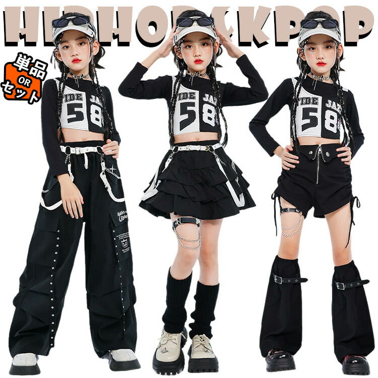黒 長袖 トップス カーゴパンツ スカート レーシング風 キッズ ダンス衣装 韓国 jazz セットアップ 上下セット おしゃれ 女の子 かっこいい かわいい へそ出し ダンスウエア ヒップホ