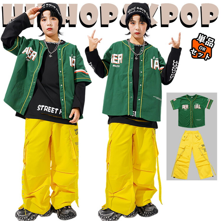 緑 黄 ベースボールシャツ キッズ ダンス衣装 半袖 セットアップ 女の子 男の子 子供 シャツ トップス サルエルパンツ ヒップホップ ジャズダンス 演出服 練習着 団体服 応援団 発表