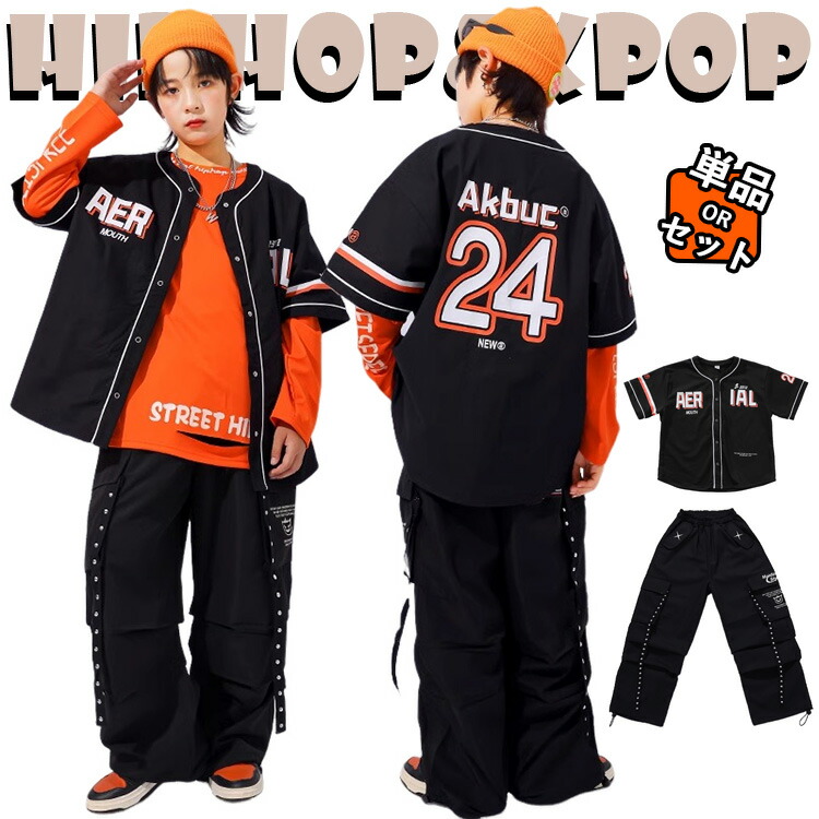 黒色 ベースボールシャツ キッズ ダンス衣装 半袖 セットアップ 女の子 男の子 子供 シャツ トップス サルエルパンツ ヒップホップ ジャズダンス 演出服 練習着 団体服 応援団 発表