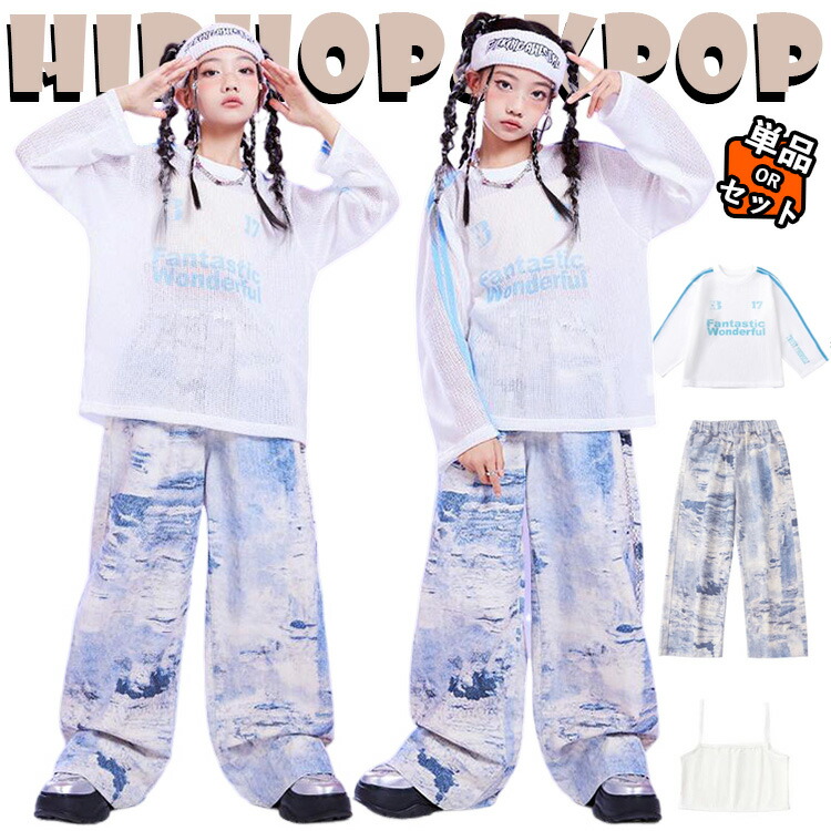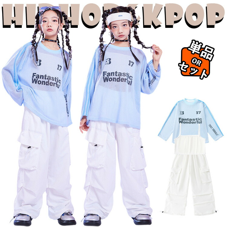 jazz 白色 メッシュ 青い 半透明 キッズ ダンス衣装 セットアップ 女の子 子供 長袖 ゆったり トップス インナー サルエルパンツ チア チアガール hiphop jazz ジャズダンス ヒッ