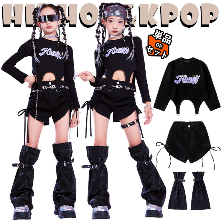 jazz 黒色 へそ出し キッズ ダンス衣装 セットアップ 女の子 子供 長袖 ゆったり カジュア トップス ショートパンツ 足カバー チア チアガール hiphop jazz ジャズダンス ヒップホ