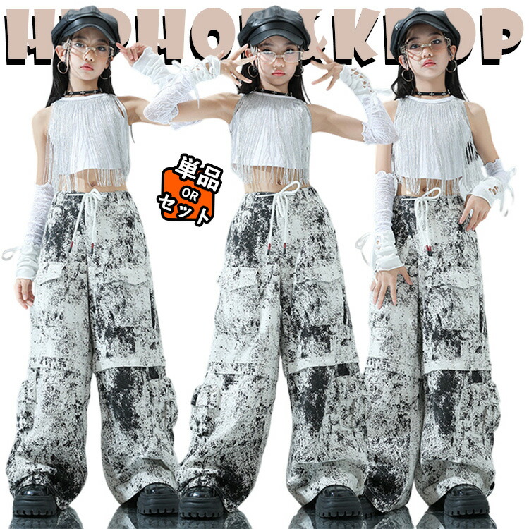 jazz 白 タッセル タイダイ柄 迷彩柄 へそ出し キッズ ダンス衣装 セットアップ 子供 カジュアル ショートトップス カーゴパンツ サルエルパンツ ジャズダンス ヒップホップ チアガー
