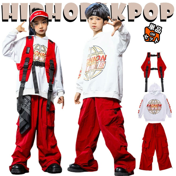 キッズ ダンス衣装 レッド ベスト 白 パーカー カーゴパンツ セットアップ 上下セット おしゃれ 女の子 男の子 かっこいい かわいい 長袖 ゆったり レーシング風 ダンスウエア ヒップ