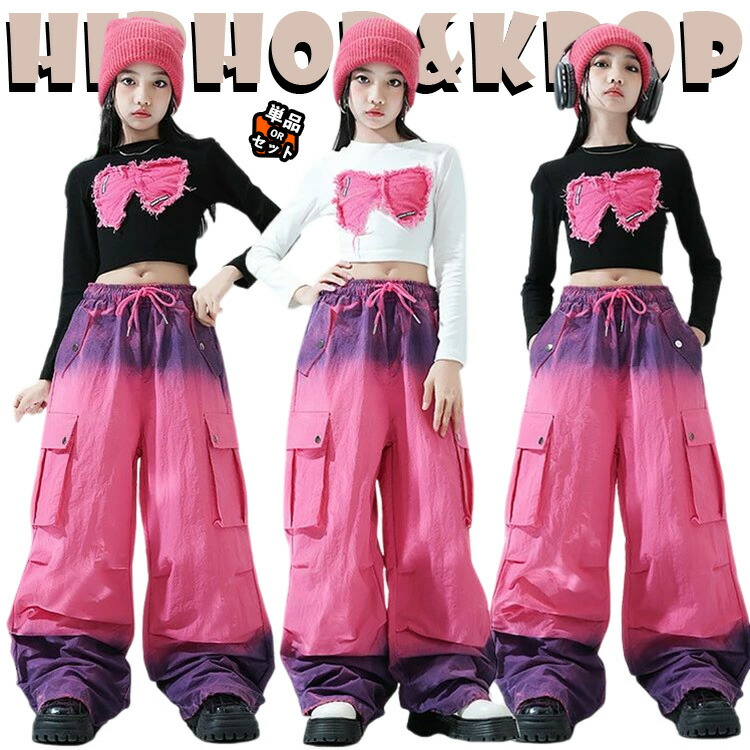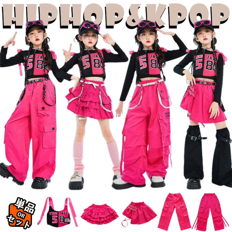 黒 トップス ローズ カーゴパンツ スカート ベルト キッズ ダンス衣装 セットアップ 上下セット おしゃれ 韓国 jazz 女の子 かっこいい かわいい へそ出し 長袖 ダンスウエア ヒップ