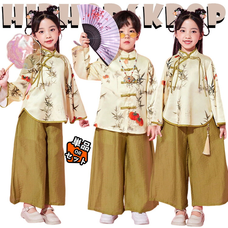 唐装 中華風 杏色 トップス カーキ カジュアルパンツ キッズ ダンス衣装 セットアップ 上下セット おしゃれ 女の子 男の子 かっこいい かわいい 長袖 ゆったり ダンスウエア ヒップホ