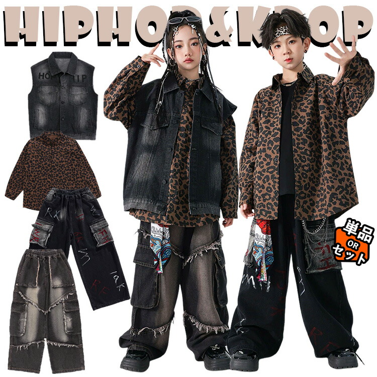 豹柄 シャツ デニム ベスト カジュアルパンツ 黒 Tシャツ キッズ ダンス衣装 セットアップ 上下セット おしゃれ 女の子 男の子 かっこいい かわいい 長袖 ゆったり ダンスウエア ヒッ