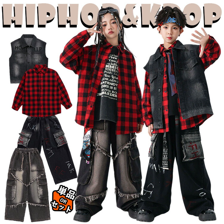 ユニセックス衣装 レッド チェック柄 シャツ キッズダンス衣装 セットアップ ジャケット 長袖 トップス 黒 迷彩 カーゴパンツ サルエルパンツ ジャズダンス ヒップホップ 韓国 -