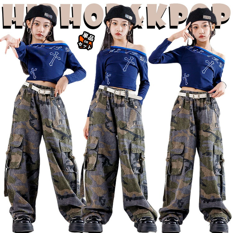 キッズ ダンス衣装 ブルー 長袖 Tシャツ 迷彩 カーゴパンツ ベルト 帽子 セットアップ 上下セット 韓国 jazz おしゃれ 女の子 かっこいい かわいい へそ出し トップス ダンスウエア