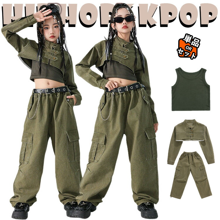 韓国 jazz カーキグリーン 長袖 トップス カーゴパンツ タンクトップ キッズ ダンス衣装 セットアップ 上下セット おしゃれ 女の子 かっこいい かわいい へそ出し トップス ダンスウ