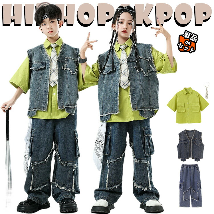 キッズ ダンス衣装 デニム ベスト グリーン シャツ カーゴパンツ ネクタイ セットアップ 上下セット おしゃれ 女の子 男の子 かっこいい かわいい 長袖 ゆったり ダンスウエア ヒップ
