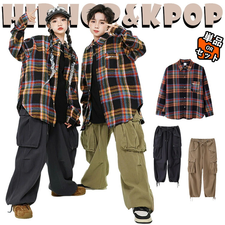 ユニセックス衣装 レッド チェック柄 シャツ キッズダンス衣装 セットアップ ジャケット 長袖 トップス 黒 迷彩 カーゴパンツ サルエルパンツ ジャズダンス ヒップホップ 韓国 K-POP
