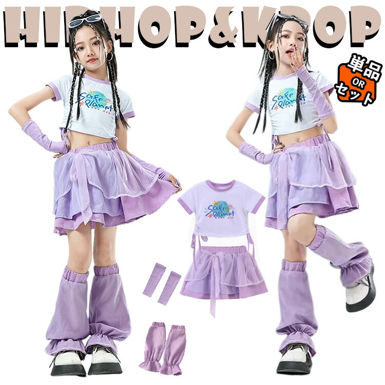 パープル キッズ ダンス衣装 セットアップ チア 女の子 チアガール 韓国 ファッション ショート丈 トップス 半袖 tシャツ へそ出し メッシュ素材 スカート レッグウオーマー アームカ
