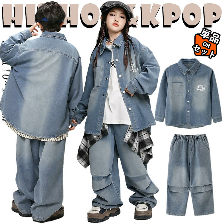 デニム セット ユニセックス衣装 キッズ ダンス衣装 セットアップ 女の子 男の子 カジュアルシャツ 長袖 シャツ ストライプ柄 トップス かっこいい パンツ ヒップホップ ジャケット
